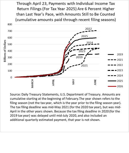 - Through April 23, payments with individual income tax filings (for tax year 2025) are about 7 percent higher than last year's amounts at this same point. There should still be some significant amounts of taxpayer payments by checks for the IRS to process over the next week or more, but the queston is how much. Amounts have fallen off in the last couple of days of processing. If that continues, then the percentage gain over last year will be less than 7 percent when the counting is likely complete for timely-filed returns in early May. There could, however, still be large amounts processed next week. The filing deadline was a day later into the week this year compared to last year (Wednesday this year vs. Tuesday last year); that could delay the comparative processing somewhat. It is always impossible for people outside of the IRS to know their speed of processing, as well as the speed at which the mailed checks get to the IRS, until all the counting is complete.