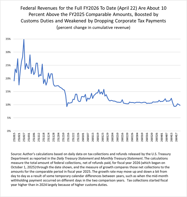 - We are tracking total federal revenues on a daily basis through fiscal year 2026 (which began on October 1, 2025, and ends on September 30, 2026). We estimate that federal revenues for the full fiscal year through April 21 were about 10 percent above the amounts at the same point in fiscal year 2025. (See the chart above for the progression of growth over the course of fiscal year 2026.) Early in fiscal year 2026, revenues were boosted well above year-ago amounts by large additions in customs duties. Declines in corporate quarterly income tax payments in mid-December and again in mid-April, probably due to recent legislation that provided corporate tax cuts, caused overall revenue growth for the fiscal year to fall at those points but remain positive. Growth in revenues from income and payroll tax withholding, the largest component of federal revenues, has remained positive, and since February overall growth in revenues for the fiscal year has remained near 10 percent or a bit above (compared to year-ago amounts).
