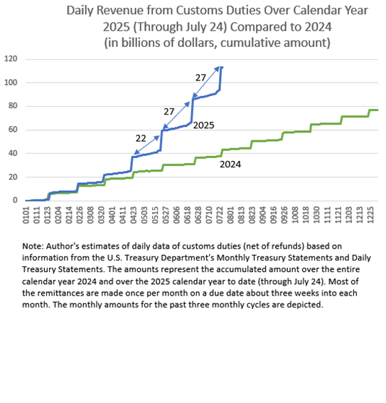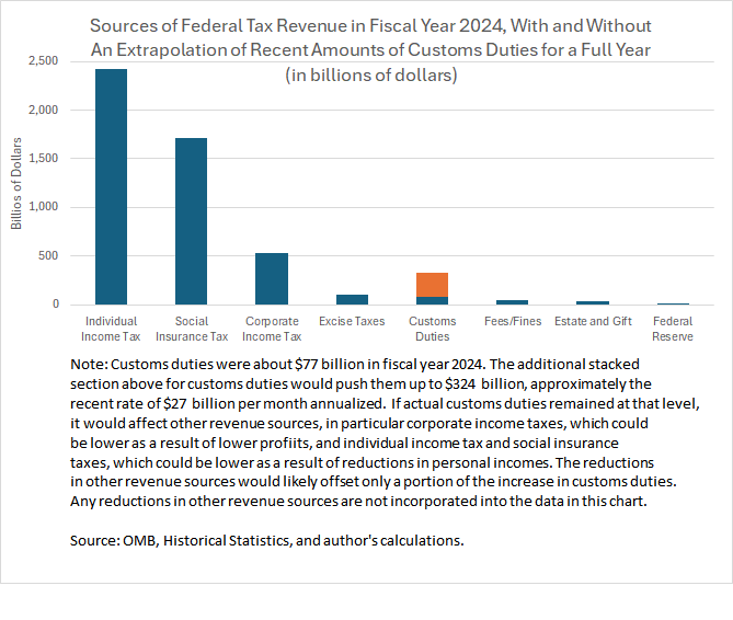 - Customs duties have soared as a result of the President imposing a wide variety of new tariffs (that is, taxes on imports) in the form of general, country-specific, and good-specific tariffs. Customs duties for the past two months have run at an annual rate of about $325 billion, about four times the 2024 amount, and which if sustained would move them from the fifth largest category of federal revenues to the fourth largest.