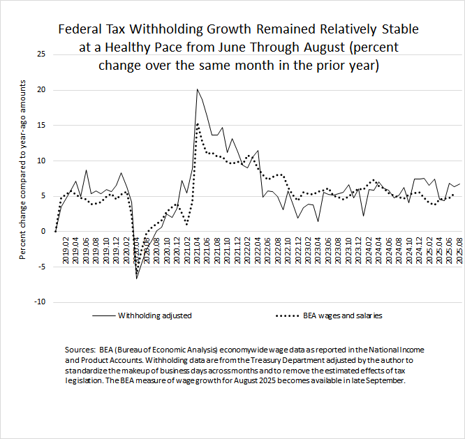 In trying to identify whether the time is right to lower short-term interest rates, the Federal Reserve continues to assess data on the state of the U.S. economy, in particular the labor market and inflation. Lots of measures exist to gauge the labor market. We are seeing federal tax withholding, which we track, continuing to grow at a healthy pace in August. Federal tax withholding tends to track economywide wages and salaries (see chart below), and wages and salaries more loosely track overall employment. We estimate that federal tax withholding–the combined amount of income and payroll taxes withheld from workers’ paychecks and remitted by employers as soon as the next day to the U.S. Treasury Department–grew by 6.8 percent in August compared to the amount from August of a year ago, very close to the growth of 6.4 percent in July and 6.9 percent in June (both compared to the same month of the prior year). That recent range is close to the growth observed over most of the past two years. We will see on Friday of this week (yes, tomorrow) what the important employment report shows for August, as released by the Bureau of Labor Statistics in the Department of Labor.