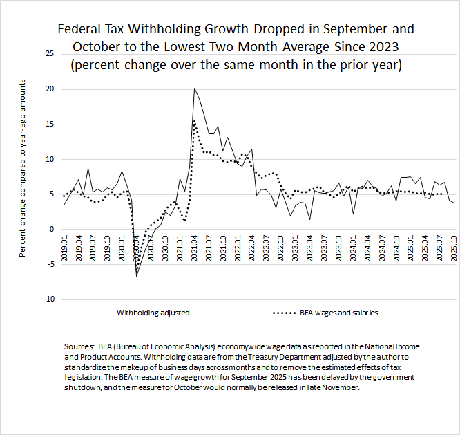 We have now observed two consecutive months with significantly reduced growth in federal tax withholding. Such withholding–the combined amount of income and payroll taxes withheld from workers’ paychecks and remitted by employers as quickly as the next day to the U.S. Treasury–grew by an estimated 3.8 percent in October following a very similar 4.2 percent in September, both compared to the amount from the same month in 2024 (see the chart below). Growth had been in the range of 6.4 percent to 6.9 percent from June to August. Indeed, the latest two-month average of 4.0 percent growth is the lowest two-month average since the first part of 2023. Because wages and salaries are a key determinant of the amount of tax withholding, we expect that the slowing growth in withholding tracks slowing growth in wages and salaries in the overall economy; the two measures track each other over long periods of time, after we adjust the withholding amounts for tax law changes and changes in the monthly calendar.
