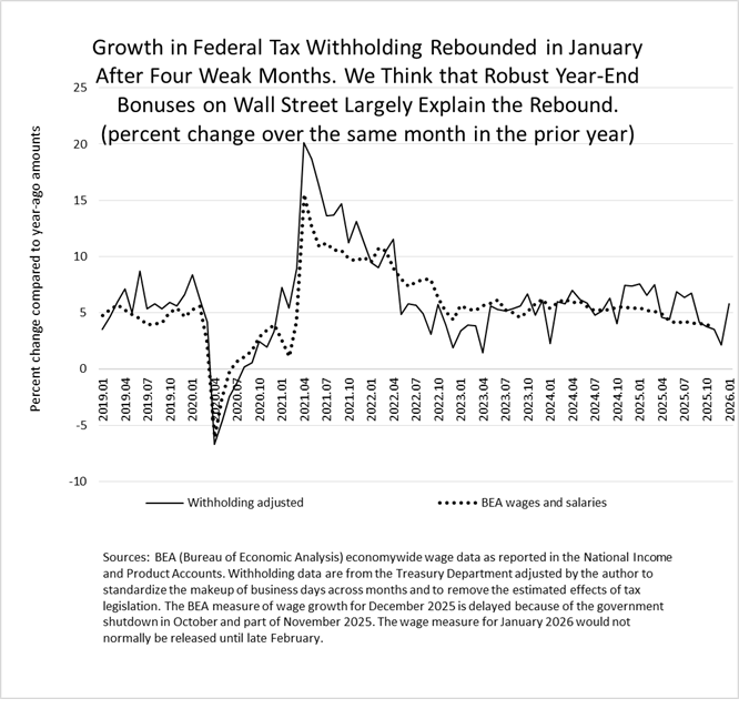 A quick take here: In January, we observed a rebound in growth of federal tax withholding–the amounts of income and payroll taxes that employers withhold from workers’ paychecks and remit to the Treasury Department as soon as the day after the workers are paid. Specifically, we estimate that tax withholding grew by 5.8 percent in January compared to the amounts from January 2025, measuring so-called year-over-year growth (see the chart below). That was about a percentage point below the 6.7 percent growth averaged from June through August last year, before growth steadily declined in September (4.2 percent), October (3.8 percent), November (3.5 percent) and December (2.1 percent). We believe that strong year-end bonuses on Wall Street and beyond explain most of the January rebound. In past years, we have observed withholding growth in January, as well as in December, temporarily moving up and down because of year-end bonuses. In addition, the multiple holidays in December and January make it harder for us to find reference periods for estimating withholding growth, which can raise the volatility in those months (see our methodology). We shall see in coming months whether the end of bonus season results in withholding growth returning more in line with its autumn 2025 amounts, or if the move up in January represents something more economywide and persistent.