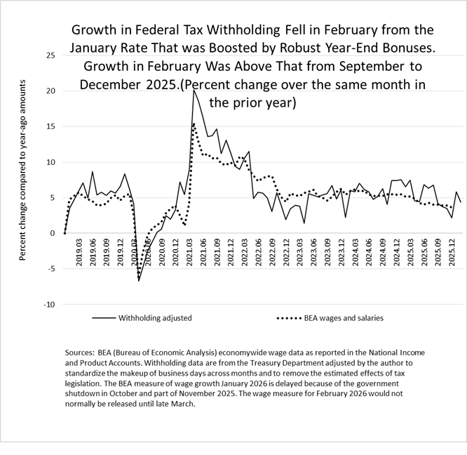 Specifically, we estimate that withholding grew by 4.4 percent in February compared to the amounts from February 2025 (so-called year-over-year growth). That growth was between the one-month jump in January (at 5.8 percent) and the growth from September to December 2025 (which averaged 3.4 percent). That growth late last year was consistent with wages and salaries in the overall economy that were growing just slightly faster than prices.