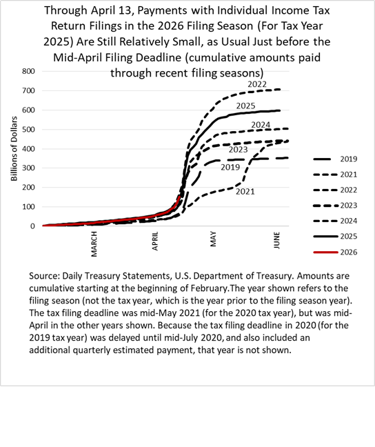 Today is the due date for filing federal income tax returns for the 2025 tax year. Payments with tax return filings, along with much smaller amounts paid as estimated tax for the first quarter of 2026, are thus due today. As usual at this point in the filing season, it is too early to see signs of how much will be paid. Amounts tabulated for the tax season since early February have risen rapidly in the past few days (see the chart below, the red line being this year), but amounts are still relatively small. In the past few years, around 20 percent to 25 percent of the full amount has typically been paid by now. Over the next few days, much will come to the IRS as electronic payments. But significant amounts will arrive at the IRS in the form of mailed checks. Those payments by check for timely-filed returns usually take the IRS two or three weeks to totally tabulate, and those amounts can surprise us until the end of the counting.